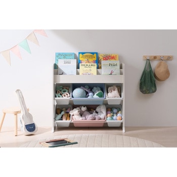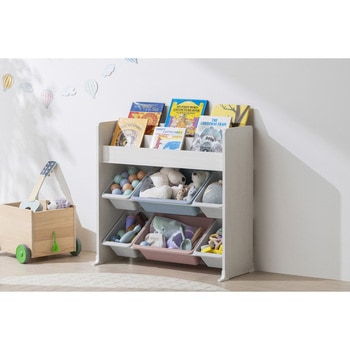色分けされていることで「どこに何を片付ける」のルールが決めやすく、お子様の自立心をサポートし楽しくお片付けができる収納用品です。表紙を見せて収納できるので、見たい本をすぐ取り出せます。ボックスはぬいぐるみやブロックなどを収納できます。上段は絵本棚になっており、上段は絵本、下段はおもちゃなど、物を分けて収納できます。絵本棚は表紙が見える状態で収納でき、読みたい本をすぐに見つけられます。ボックスは2,3色、大×2 小×4で分けられているため、大きいものから細かいものまで片付けでき、お子様とのルールを決めやすいカラーリングです。安定感のある広いふち幅。お子様でも安心の角丸設計です。