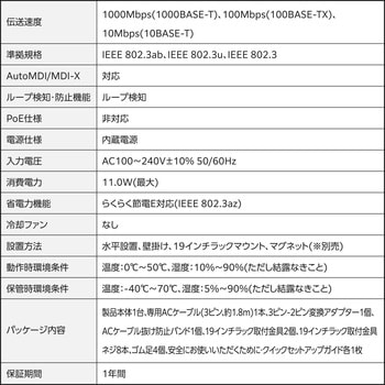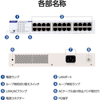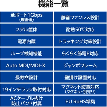 仕様●Auto MDI/MDI-X:対応●BPDU透過機能:対応●EAP透過機能:対応●スイッチングファブリック:48.0Gbps●ノンブロッキング:対応●パケット転送速度:1,488,095パケット/秒(1000Mbps)、148,809パケット/秒(100Mbps)、14,880パケット/秒(10Mbps)●バッファメモリー:512Kbytes(各ポートに動的割り当て)●ループ検知・防止機能:ループ検知●最大実効伝送速度:24.0Gbps●省電力機能:らくらく節電E対応(IEEE 802.3az)●専用オプション品|マグネット:EHB-EX-MG4●測定時のポート速度とポート数:1Gbps:24ポート●盗難防止:セキュリティスロットなし●壁掛け用穴:あり(間隔:120mm)●冷却ファン:なしセット内容製品本体1台 専用ACケーブル(3ピン、約1.8m)1本 3ピン-2ピン変換アダプター1個 ACケーブル抜け防止バンド1個 19インチラック取付金具2個 19インチラック取付金具ネジ8本 ゴム足4個 安全にお使いいただくために1枚 クイックセットアップガイド1枚材質メタル質量(kg)約1.1(本体のみ)色ホワイト外形寸法(mm)幅約267.0×奥行約125.0×高さ約42.0(本体のみ)ポート数24ポート消費電力(W)11.0(最大)適合規格VCCI Class Aコネクタ形状RJ-45×24入力電圧(V)AC100~240±10% 50/60Hz準拠規格IEEE 802.3ab、IEEE 802.3u、IEEE 802.3通信方式フルデュプレックス、ハーフデュプレックス保管温湿度範囲温度:-40℃~70℃、湿度:5%~90%(ただし結露なきこと)保証期間1年間動作温湿度範囲温度:0℃~50℃、湿度:10%~90%(ただし結露なきこと)適合ケーブル1000BASE-T:UTPカテゴリー5e以上、100BASE-TX:UTPカテゴリー5以上、10BASE-T:UTPカテゴリー3以上設置方法水平設置、壁掛け、19インチラックマウント、マグネット(別売 EHB-EX-MG4使用)発熱量(KJ/h)約39.6(最大)電源仕様内蔵電源フローコントロール制御IEEE 802.3x(フルデュプレックス時)、バックプレッシャー(ハーフデュプレックス時)MACアドレス登録数8,192件(全ポート合計)オートネゴシエーション対応ジャンボフレーム対応(15Kbytes)スイッチング方式ストア&フォワード伝送速度1000Mbps(1000BASE-T)、100Mbps(100BASE-TX)、10Mbps(10BASE-T)エネルギー消費効率(W/Gbps)0.5最大パケット転送能力(Mpps)35.71MTBF(時間)440000@25℃、143000@50℃PoE対応非対応内容量1個