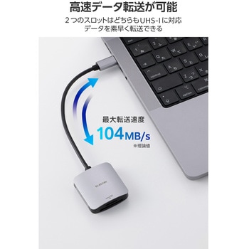 パソコンやタブレット、スマートフォンと接続する際、2つのスロットはどちらもUHS-I(最大104MB/s)に対応しているので、高速なデータ転送が可能です。 ※理論値