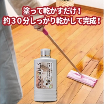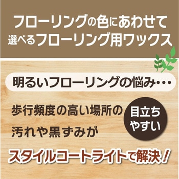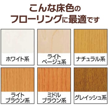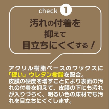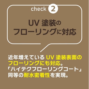 汚れを付着しにくくして、目立ちにくくする効果アクリル樹脂ベースのワックスに<硬い>ウレタン樹脂を配合。従来の皮膜より硬度を増すことにより、表面に汚れが付着しにくく、また、皮膜の下に汚れが入りにくくなることにより、明るい色の床材でも汚れが目立ちにくくなります。UV塗装のフローリングに対応新しいフローリング材に多いUV塗装にも対応。「ハイテクフローリングコート」同等の耐水密着性を実現。
