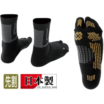 足首はテーピングサポート編みで可動部を包むようにホールドし、足首のぐらつきを抑えます。先割れ構造と指裏の滑り止めで指先の踏ん張りをサポート。土踏まずの空間にソールクッションを配置し、足裏への衝撃を緩和します。