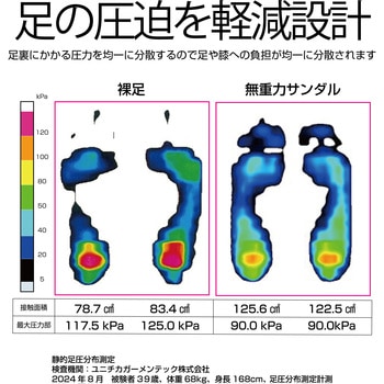 まるで浮いてる履き心地、無重力サンダル。●足の圧迫を軽減設計。●足裏にかかる圧力を均一に分散するので足や膝への負担が均一に分散。●足裏が受ける荷重・衝撃を分散するような設計。●S/22.5~24cm、M/24.5~26cm、L/26.5~28cm