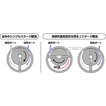 逆流防止電磁弁付き超小型真空ポンプ HFC、HCFC、CFC対応型排気ポートと吸気ポートとの間に大きな差圧を乗じさせるように吸気された空気は2つのローターにより、より高圧縮状態で排気される構造になっております。この構造は吸気ポート側のローターに逆圧負荷がかからず、スムーズに排気回転することにより、小型であってもより高い真空状態を作る事が出来ます。