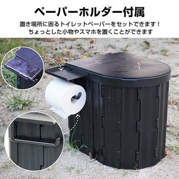 トイレットペーパーホルダー付きの簡易トイレです。アウトドアや断水時、介護まで幅広く活躍する折りたたみ式簡易トイレ。水不要で、排泄処理袋と凝固剤付きだからすぐに使えます。ひょうたん型便座で快適フィットし、非常時以外はゴミ箱やイスとしても利用可能です。収納にも困らない便利アイテムです。