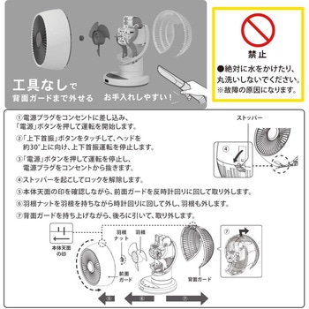 工具なしで背面ガードまで外せてお手入れしやすい風量調節3段階(弱/中/強)切タイマー3段階(1h/2h/4h)左右3段階(90°/180°/360°)、上下約90°自動首振り適用畳数18畳まで ※風量強(最大)時でのメーカー基準(目安)リモコン付き