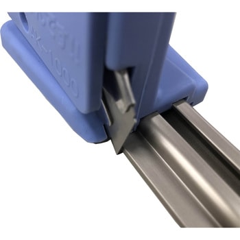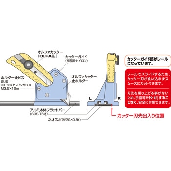 カッターガイドに固定されたカッター本体がレールでスライドする為、カッター刃が食い込まずスムーズで正確なカットが可能。刃先を乗り上げることが無い為、手指等を「ケガ」することなく安全に作業できます。アルミ本体フラットバーの裏面はネオスポ(W29×0.8t)貼りでズレにくい。