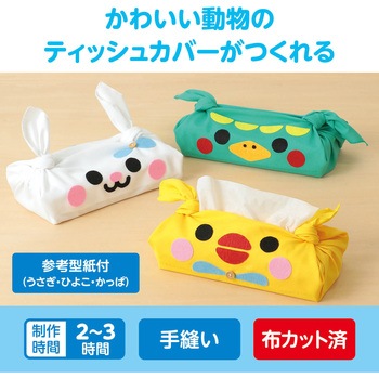 動物モチーフのかわいいティッシュボックスカバーが作れる手芸キットです。布をカットする必要がなく、すぐに始められるので初心者さんにも安心。製作時間の目安は約2~3時間です。うさぎ・ひよこ・かっぱの参考型紙付きで、子どもから大人まで楽しく製作できます。フェルトシールを貼るだけで簡単に装飾でき、自分らしいアレンジも可能です。まつり縫いやボタン付けなどの基礎を学べるので、裁縫の入門にもぴったり。気軽にハンドメイドを楽しみながら、実用的でかわいいアイテムを完成させることができます。