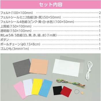 セット内容フェルト(グレー)×1、フェルト(ピンクベージュ)×1、フェルトシール4色組(ピンク・黄・白・水色)×1、フェルトシール2色組(赤・黒)×1、上質紙×1、透明板×1、刺しゅう糸5色組(白・黄・赤・緑・水色)×1、ボタン×1、ボールチェーン×1、ゴムひも×1材質フェルト:ポリエステル、フェルトシール:ポリエステル、上質紙:紙、透明板:PP、刺しゅう糸5色組:綿、ボタン:プラスチック、ボールチェーン:、ゴムひも:ポリウレタン寸法(mm)【完成サイズ】ハリネズミ…100×115【フェルト】100×100【フェルトシール4色組】100×50【フェルトシール2色組】50×50【上質紙】150×100【透明板】150×100【刺繍糸5色組】1m【ボタン】Φ13【ボールチェーン】80【ゴムひも】1m内容量1セット
