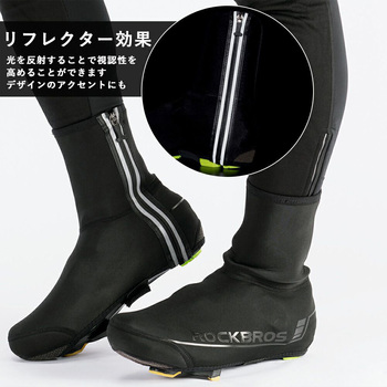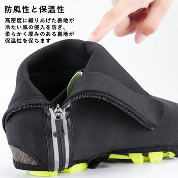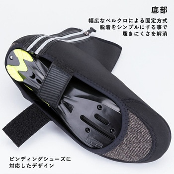 ビンディングシューズやスニーカーの上から履くだけで、冷たい風や雨をしっかりガードします。撥水効果のある表面素材と止水ファスナーが、ファスナー部分からの浸水を防止。デザインのアクセントには反射ラインを採用し、夜間の視認性もアップ。