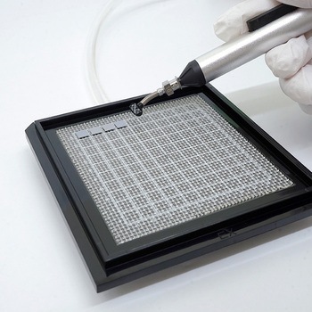 真空装置を用いて部品をピックアップする、ノンシリコーン仕様の精密部品搬送ケースです。搬送時の振動などから精密部品の破損を防ぎます。積載面には自己粘着性のあるゲルを使用し、粘着剤を使用していないため部品に糊移りしません。搬送時は部品をしっかり固定し、真空引き時は簡単に部品をピックアップできます。粘着力の経時変化が少なく、ピックアップの軽さを保ちます。ケースは積み重ねが可能です。