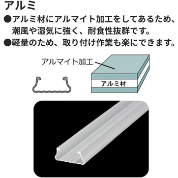 結露水が集まるハウス肩部や谷部などに適したフィルム止め材です。『ビニペット』形状部にフィルムを展張することで、フィルム裏面に付着した結露水を集め、『ツユトールジョイント』からきれいに排水されます。『ビニペット』形状部は深溝形状となっているため、フィルム+防虫ネットも楽々展張することができます。金具での固定が可能なため、あらゆるハウスに取り付けできます。
