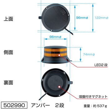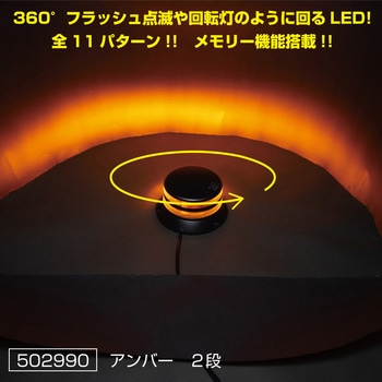 11パターンの回転やフラッシュ点滅を搭載した、点滅パターンを固定できるメモリー機能付きランプシガープラグに内蔵されたスイッチで点滅パターンの切り替えやON/OFFが可能LEDは2段タイプと3段タイプの2種。カラーはアンバーとブルー取付けは強力なマグネット固定式。12V車/24V車共用