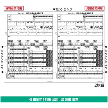 【令和8年1月提出用】マイナンバー記載に対応した源泉徴収票です。「市区町村提出用・税務署提出用」1枚と「受給者交付用」1枚の2枚組です。