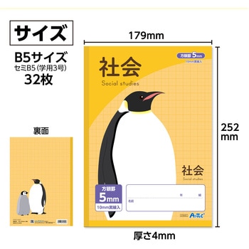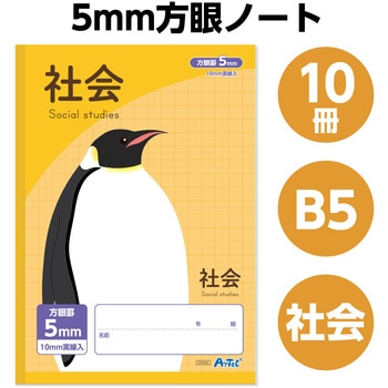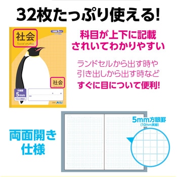 科目がひと目でわかる!書きやすさと見やすさを両立した社会ノート!B5サイズの5mm方眼社会用ノート10冊セットです。上下に科目名が入っていて、ランドセルや引き出しから出す時にもすぐ見つかります。無線綴じでページがしっかり開くので書きやすく、地理や歴史のまとめ、地図作成にもぴったり。長時間使っても目が疲れにくい水色の罫線と、白色度が高く見やすい紙を採用しています。学習やドリル用としてたっぷり使える32枚入りです。 学校や家庭学習にぴったりのお得な10冊セットです。