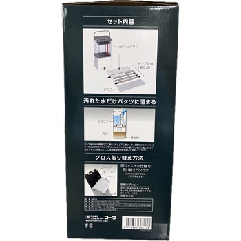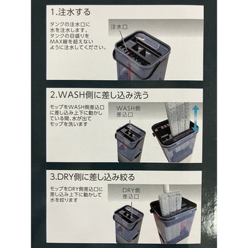 毎回きれいな水で洗えて、汚れた水は分離される。手を汚さずにクロスを洗って絞れる。モップを上下に動かしている間だけ水が出ます。必要な分だけ水が出るので水タンクが長持ちします。最大20回(水タンク満水時、上下5回を1回とする)洗えます。クロスは2枚(モップ本体装着しているクロス1枚とパッケージ入りの1枚)になります。