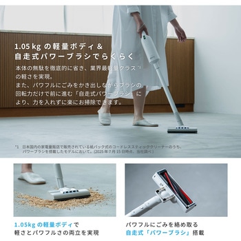 ・本体のパーツや形状を見直し、徹底的に無駄を省くことで業界最軽量クラス*の軽さを実現した1.05kgの軽量ボディ(*日本国内の家電量販店で販売されている紙パック式のコードレススティッククリーナーのうち、パワーブラシを搭載したモデルにおいて。(2025年7月15日時点、メーカー調べ))