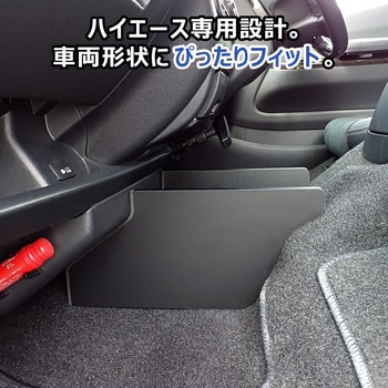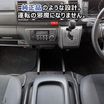 ・ハイエースの運転席と助手席の間に設置できる専用フロアコンソール。・足元スペースを有効活用し、ドリンクやティッシュ、スマートフォンなどを整理収納。・車両形状にぴったりフィットし、内装に自然に馴染むデザイン。・木製ならではの安定感と高級感があり、純正品のような仕上がり。・車体への加工不要で簡単に取り付け可能。・国内自社工場でNC加工により高精度・高品質に製作。