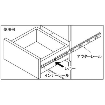 引出しが完全に引き出せる三段引きのスライドレールです。矢印のレバーを解除しますと、インナーレールの取り外しが出来ます。アウター取付部のクッション効果により、キャビネットの多少の変形にもスムーズなスライドが得られます。