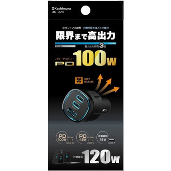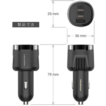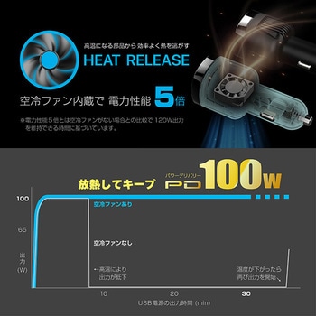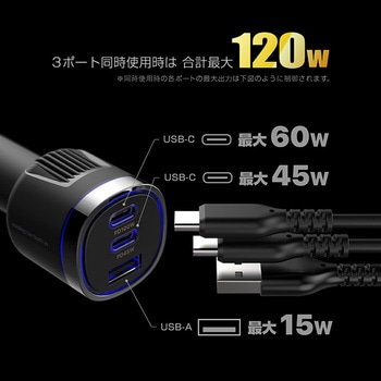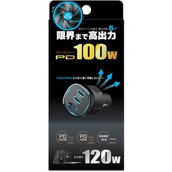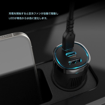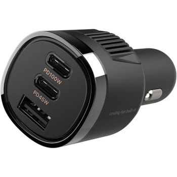USB PD搭載のクルマ用ハイパワーUSB電源(単独使用時最大100W、他ポート同時使用時は最大60W)USB PD充電のノートPCを2台同時にできる高出力タイプ。空冷ファン内蔵で高温による出力低下を防ぎ3大同時でも充電時間を短縮できる。USB-Aポートは自動識別機能搭載でQC3にも対応。暗い場所でもUSBポートを照らす青色LEDランプ。DC12V~24V対応、軽自動車から大型車まで使用可能。