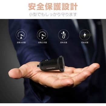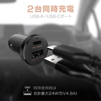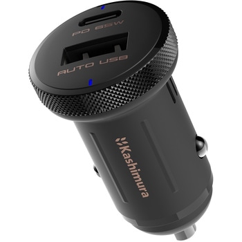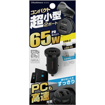 USB PD搭載のクルマ用ハイパワーUSB電源、最大出力65W対応。超コンパクト設計でDCソケットからの出っ張りが短い。USB-CはPDの高速充電に対応。USB PD充電のノートPCにも使える高出力タイプ。暗い状況でもUSBポートがわかる青色LEDランプを搭載。DC12V~24V対応。軽自動車から大型車まで使用可能。