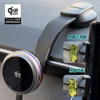 Qi2.2ワイヤレス充電国際規格認証品。充電ON/OFF機能付き。充電OFF時に、冷却スマホクーラーに変身可能!コンパクトサイズ&サイドイルミ付き(発光色切り替え可能)フレキシブルローアングル吸盤取り付け。