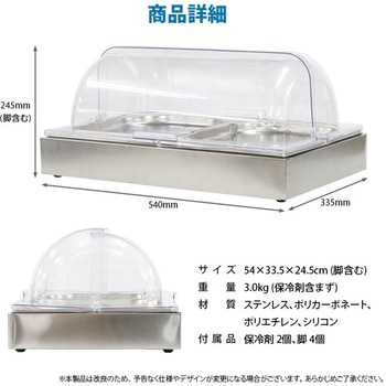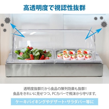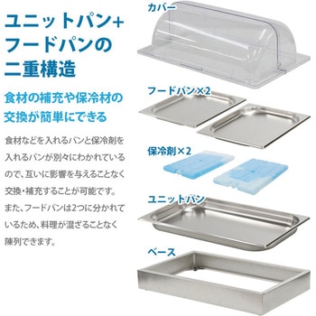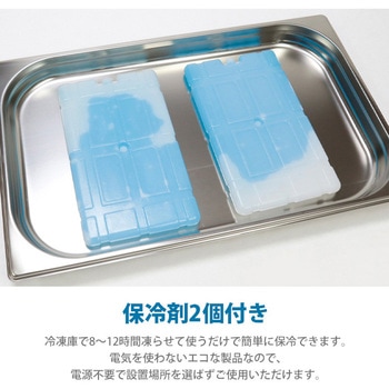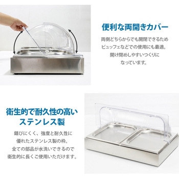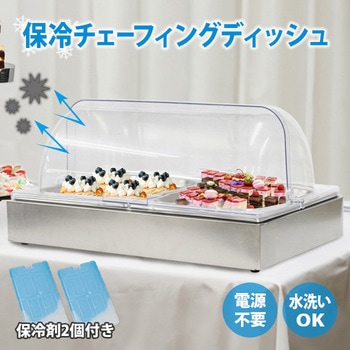 鮮度を長時間キープする保冷チェーフィングディッシュ。冷凍庫で凍らせた付属の保冷剤を使うだけ。電源不要で食品の鮮度を保ちます。両側どちらからでも開閉できるカバーで外からの菌を徹底バリア。水洗いOKでお手入れも簡単です。高透明度だから食品の陳列効果も抜群です。各種イベントや催事で大活躍。