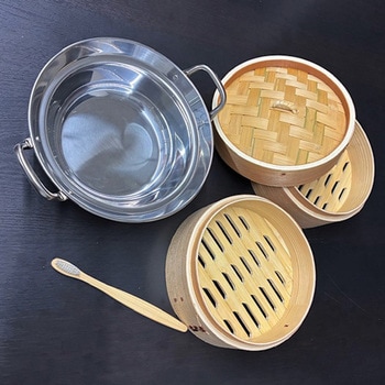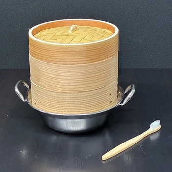 蒸しせいろを気軽に楽しめる2段セット。中華セイロは側面に杉、天面底に竹、取っ手に藤、留めに桜皮を使用した天然素材100%のセイロです。IH対応のセイロ用ステンレス鍋付き。セイロのお手入れ(洗浄時)に便利な竹柄ブラシ付き。スノコや編み目の隙間など細部の汚れを落とすのに最適です。