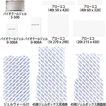 バイオクールジェル0-900Ax14枚、ジェルウォール31(2枚)x1式、バイオクールジェル0-300Ax4枚、バイオクールジェル5-500×8枚、45用ジェルボックス天地用(1個)x1式、45用ジェルボックス側面用(1個)x5式、アローエコ(40t 50×420)x2枚、アローエコ(40t 60×320)x2枚、アローエコ(20t 215×430)x2枚、アローエコ(5t 270×290)x4枚
