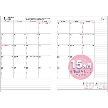背がしなやかでとじ目まで開きやすい糸かがりとじ製本のブロックタイプ見開き1ヶ月ダイアリーです