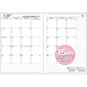 背がしなやかでとじ目まで開きやすい糸かがりとじ製本のブロックタイプ見開き1ヶ月ダイアリーです