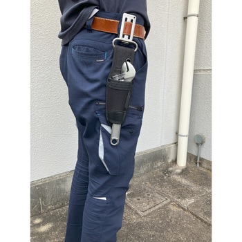 ベルト幅50mm用のプレートに、楕円型のカラビナが取り付けられたツールフックです。カラビナ部分に工具差しを取り付ければ、工具差しを低い位置に保持できるようになります。
