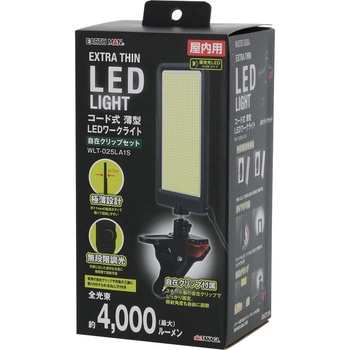 用途夜間・暗い場所での作業に使うことができます。また、本製品は用途に応じて光量を調節することができます。付属品コード式薄型LEDワークライト本体 ×1、ACアダプター ×1、自在クリップ ×1、取扱説明書 ×1質量(kg)(本体)約0.3 (クリップ)約0.35 (取付け時)約0.65、約0.21使用温度範囲(℃)5~40定格電圧(V)DC12、AC100寸法(長さL×幅W×高さH)(mm)(本体)約26×129×246(クリップ)約127×80×150 (取付け時)約127×129×385コード長さ(m)約3.0定格周波数(Hz)50/60定格消費電力(W)25全光束(Lm)~約4,000出力電圧(V)DC12色温度(K)約6,500使用電球白色LED(交換不可)能力(mm)【クリップ/最大】丸棒(単管):Φ49/角材:厚さ40内容量1個