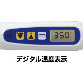 はんだ付け対象に合わせて設定温度を200℃から500℃まで1℃単位で調節出来ます。振動センサーによるスリープ、シャットダウンの設定が可能。暗証番号方式によるキーロックが可能(作業者が無断で温度変更出来ない機能)。熱回復力に優れ、製造現場での連続したはんだ付け作業にも対応。