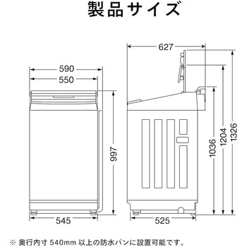 付属品給水ホース・給水ホースジョイント・保護カバー・ネジ(保護カバー取付用)質量(kg)約37電源(V)AC100(50/60Hz)消費電力(W)620/640(50/60Hz)寸法(幅W×奥行D×高さH)(mm)550×627×995電源コード(m)約1.9機能搭載コース:標準・快速・メモリ・すすぎ0回洗剤専用・おしゃれ着・つけおき・毛布・槽洗浄、その他機能:液体洗剤・柔軟剤自動投入チャイルドロック・フタロック・強水流・風乾燥・槽乾燥乾燥質量(kg)風乾燥:2.0 ( 化繊 ) / 4.0 ( 一般衣類 )運転音(dB)39/48(洗い/脱水)防水保護等級IPX4標準使用水量(L)136設置寸法(mm)約590×627×1036(給・排水ホースを含む)洗濯/脱水容量(kg)9.0(乾燥布質量)水量(L)(標準)68内容量1個