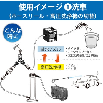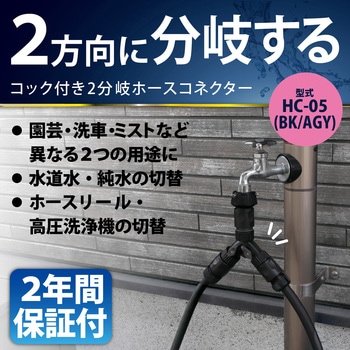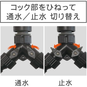 2方向に分岐する散水コネクターです。コック部をひねって通水・止水の切り替えが簡単にできます。園芸・洗車・ミストなど異なる2つの用途の切り替えに便利です。水道水と純水、ホースリールと高圧洗浄機の切り替えなどにも便利です。