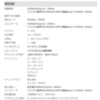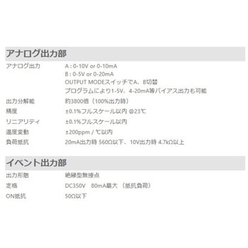 仕様●アイソレーション:センサ電源・入力回路 - アナログ出力 - イベント出力間●イベント入力回路:フォトカプラ直列抵抗1.2kΩ;12Vにプルアップ●ローパスフィルタ:無し / 50kHz (-3dB)●使用温度/保存温度(℃):0-40/-5-50●電源インジケータ:緑色LED●入力インジケータ:赤色LED、トリガ時点滅、連続パルス入力で点灯●入力回路:フォトカプラ直列抵抗1.2kΩ●入力波高値:最大±30V電源センサ:+12V 40mA(最大)測定方式ぺリオマチックTMB(周期演算方式)入力方式単相入力信号IN+ - IN-間/Lレベル 1.2V/Hレベル 4V以上消費電力(VA)AC電源最大10VA、DC電源最大5VAパルス幅0.9μ以上(デューティ比50%)/ 1.2μ以上(デューティ比50%以外)耐衝撃性15G X、Y、Z ±6方向 各3回耐振動性能10 - 55Hz 片振幅0.35mm / X、Y、Z 各方向 45分 10サイクル絶縁耐圧(V)AC500 (1分間)内容量1台
