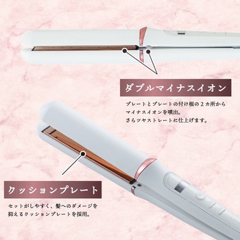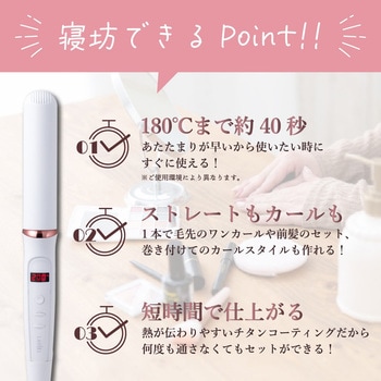 180℃まで約40秒!忙しい朝に頼もしい温度上昇の早いヒーターを搭載したストレートアイロンです。熱の伝わりやすいチタンコーティング、セットしやすく髪へのダメージを抑えるクッションプレートを採用し、何度も通さなくてもサラサラストレートに仕上げます。カールスタイルも作りやすい形状で前髪のセットやワンカールなどのアレンジもお楽しみいただけます。