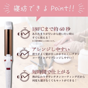 180℃まで約60秒!忙しい朝に頼もしい温度上昇の早いヒーターを搭載したカールアイロンです。滑りがよいチタンコーティングプレートで髪が引っかかることなく、優しくスムーズにセットできます。ブラシアタッチメント付きで初心者の方は前髪・顔周りの毛のセット時も安心。38mmの大きめなカールは韓国風スタイルやロングヘアの方にオススメ。
