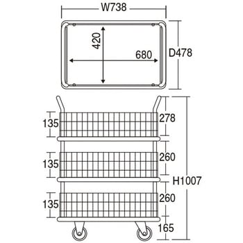 シズかるスーパー三段式ワゴン台車・コボレ止め金網付き・フットブレーキなし