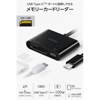 用途撮影データ転送がもっと速く快適になる、パソコンやスマホ、タブレットへの接続に便利なUSB Type-C(TM)プラグのケーブル付きメモリーカードリーダーです。