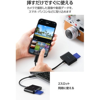 撮影データの転送をもっと速く快適に!パソコンやスマホなどへの接続に便利なUSB Type-C(TM)プラグのケーブル付きメモリーカードリーダーです。パソコンやスマホを充電しながらデータ転送が可能。SD/microSDの2スロットを同時に使用でき、デジタルカメラなどで撮影した画像や映像データを接続した機器へまとめて転送できるので、データ編集やSNS投稿に便利です。