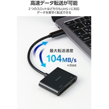 パソコンやタブレット、スマートフォンと接続する際、2つのスロットはどちらもUHS-I(最大104MB/s)に対応しているので、高速なデータ転送が可能です。 ※理論値