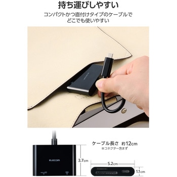 色ブラック外形寸法(mm)幅約52×奥行約27×高さ約11 ※ケーブル含まず対応OS(Android)Android16/15/14、(Windows)Windows 11/10、(iOS)iOS 18、(iPadOS)iPadOS 18、(macOS)macOS15 Sequoia動作環境温度5℃~40℃、湿度30%~80%(結露なきこと)保証期間1年間最大データ転送速度(Mbps)(理論値)104コネクタ(アップストリーム):USB Type-C(TM)プラグ<USB>スロット2ケーブル長(cm)約12 ※コネクター含まずUSBポート(ダウンストリーム)USB Type-Cポート×1<給電専用USB PowerDelivery対応(最大入力100W/最大出力98W)>対応SDカードSD(DS/HS)、SDHC(DS/HS/UHS-I/UHS-II※/SDExpress※)、SDXC(DS/HS/UHS-I/UHS-II※/SDExpress※)対応microSDカードmicroSD(DS/HS)、microSDHC(DS/HS/UHS-I/UHS-II※/SDExpress※)、microSDXC(DS/HS/UHS-I/UHS-II※/SDExpress※)内容量1個