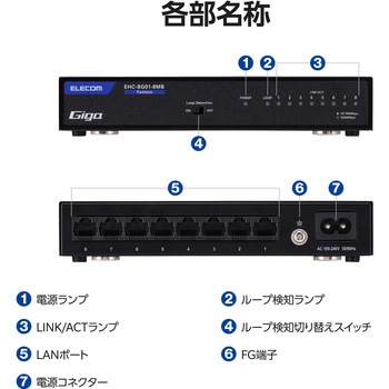 セット内容製品本体1台 専用ACケーブル(2ピン、約1.8m)1本 安全にお使いいただくために1枚 ※ゴム足・マグネットは製品本体に取付済みです。水平設置の際もマグネットを付けたままご使用ください。材質メタル(ブラック)質量(g)約420(本体のみ)外形寸法(mm)幅約171.5×奥行約83.6×高さ約30.0(本体のみ)ポート数8ポート消費電力(W)3.4(最大)適合規格VCCI Class Bコネクタ形状RJ-45×8入力電圧(V)AC100~240±10% 50/60Hz準拠規格IEEE 802.3ab、IEEE 802.3u、IEEE 802.3通信方式フルデュプレックス、ハーフデュプレックスバッファメモリ512Kbytes(各ポートに動的割り当て)保管温湿度範囲環境条件:-40℃~70℃、湿度:5%~90%(ただし結露なきこと)保証期間1年間動作温湿度範囲環境条件:0℃~50℃、湿度:10%~90%(ただし結露なきこと)適合ケーブル1000BASE-T:UTPカテゴリー5e以上、100BASE-TX:UTPカテゴリー5以上、10BASE-T:UTPカテゴリー3以上設置方法水平設置、壁掛け、マグネット電源仕様内蔵電源フローコントロール制御IEEE 802.3x(フルデュプレックス時)、バックプレッシャー(ハーフデュプレックス時)MACアドレス登録数8,192件(全ポート合計)オートネゴシエーション対応ジャンボフレーム対応(15Kbytes)スイッチング方式ストア&フォワード伝送速度1000Mbps(1000BASE-T)、100Mbps(100BASE-TX)、10Mbps(10BASE-T)エネルギー消費効率(W/Gbps)0.6MTBF(時間)750,000(a)25℃、287,000(a)50℃内容量1個