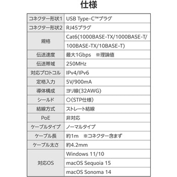 適合環境配慮事項:EU RoHS指令適合(10物質)、THINK ECOLOGYマーク色ブラック外形寸法(mm)幅約16×奥行約75×高さ約6(USB Type-Cプラグ部)規格Cat6(1000BASE-TX/1000BASE-T/100BASE-TX/10BASE-T)ケーブル長(m)約1 ※コネクター含まずコネクタ形状USB Type-C(TM)プラグ、RJ45プラグ対応PoE:×、ソフト:MACアドレスチェンジャー構成導体:ヨリ線(32AWG)形態パッケージ:袋、シールシールド○(STP仕様)結線方式ストレート結線伝送速度最大1Gbps ※理論値定格入力5V/900mA伝送帯域(MHz)250ケーブル太さ(mm)約4.2対応プロトコルIPv4/IPv6ケーブルタイプノーマルタイプ内容量1個