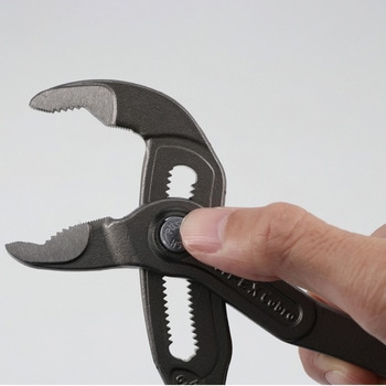 ワークに直接当て、ボタンプッシュで調整できます。様々な大きさの工作物に最適に適合させるための精密調整と握りやすいハンドルポジションです。パイプとナットにセルフクランプ:ワークピース上で滑らず、楽に作業できます。掴み面には特殊焼き入れされた歯がつけられています。歯の硬度は約 61 HRCで、耐摩耗性が高いので、確実な掴みが長期間続きます。ボックスジョイント構造:ダブルガイドにより非常に安定しています。ヒンジボルトが確実にかみ合うので、調整のずれがありません。挟み込み防止により、指が挟まれるのを防ぎます。