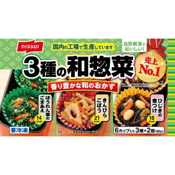凍ったまま(カップごと)お弁当に入れるだけの定番おかず「ほうれん草のごまあえ」「きんぴらごぼう」「ひじきの煮つけ」を2カップずつ入れた3種の和惣菜です。「ひじきの煮つけ」と「きんぴらごぼう」に焼津製造かつお節のだしと北海道産昆布のだしを使用しだしの旨みとコクが引立つ味わいです。自然解凍で召しあがれます。外袋のインキの10%に植物由来原料を使用しています。