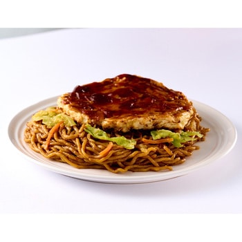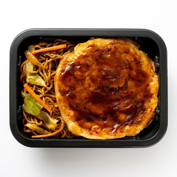 焼きそばは自家製麺を使用し鉄鍋で炒めあげ、お好み焼きはたっぷりのキャベツに卵ととろろを加えふんわり焼き上げました。一つで二つの味が楽しめる商品です。