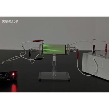 低電圧駆動タイプのクルックス管。真空管内の-極から+極に向かって流れる陰極線が、管内に設置された平行板電極の+側に引き寄せられて湾曲することから、陰極線の正体が「負の電荷を持った電子の流れ」であることを確認できます。上下方向から磁石を近づけると、直進する陰極線が曲げられる実験も行えます。