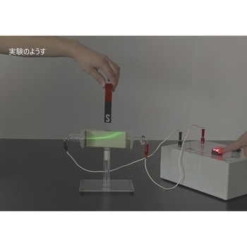 低電圧駆動タイプのクルックス管。上下方向から磁石を近づけると、直進する陰極線が曲げられることを観察できます。